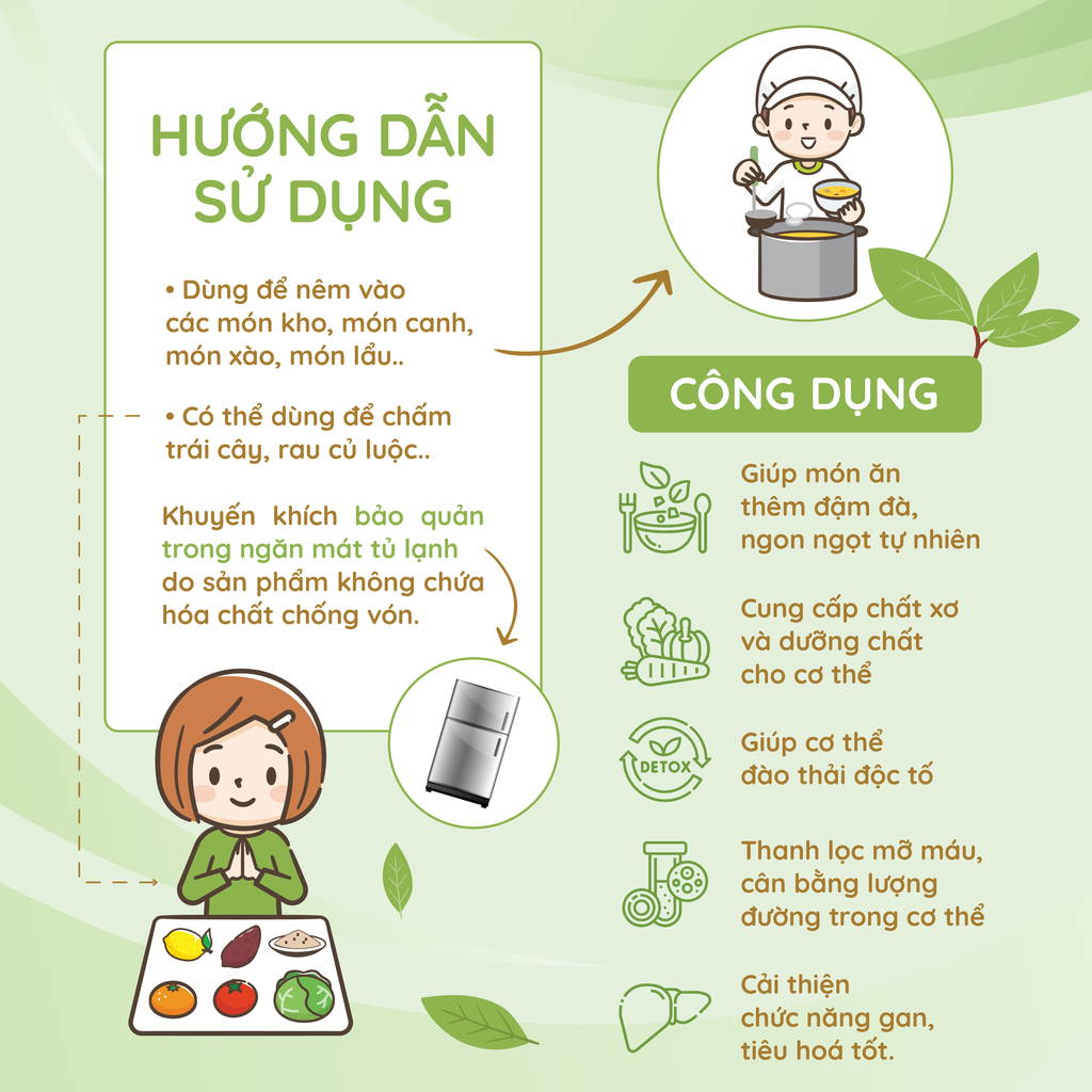 Hướng đẫn sử dụng: Bột nêm từ rau củ quả 100% thiên nhiên không bột ngọt, không chất ảo quản. Sử dụng nêm nếm đồ ăn đậm đà thay cho mỳ chính. Dùng để nêm vào: Món kho, món canh, món xào, món lẩu. Phù hợp với người ăn mặn , ăn chay, thuần chay, thực dưỡng và đặc biệt phù hợp cho trẻ em, bà bầu.