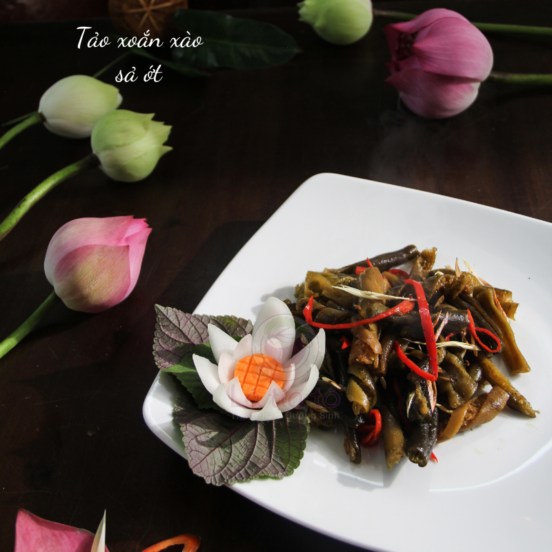 - Ngâm 30 phút rửa sạch, để ráo cắt khúc vừa ăn. Đun sôi nước cho chút dấm, khử tanh, cho tảo vào trần 30 giây rồi thử bấm vào tảo được thì vớt ra (tránh trần lâu sẽ bị nhũn, trần chưa tới sẽ bị dai).